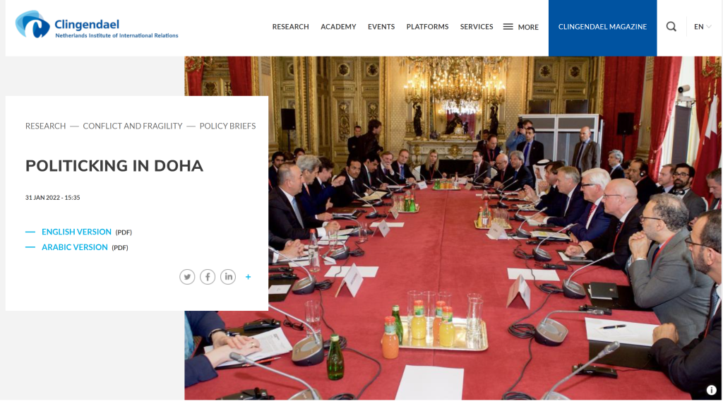 In my first policy brief for the Clingendael Institute in the Netherlands, published on 31 January 2022, Lars Hauch and I discuss a workshop organised by Syrian oppositionists in Doha and what it says about the forces working to topple the Assad regime and the state of the UN-led political process. Below is a brief summary of the paper.